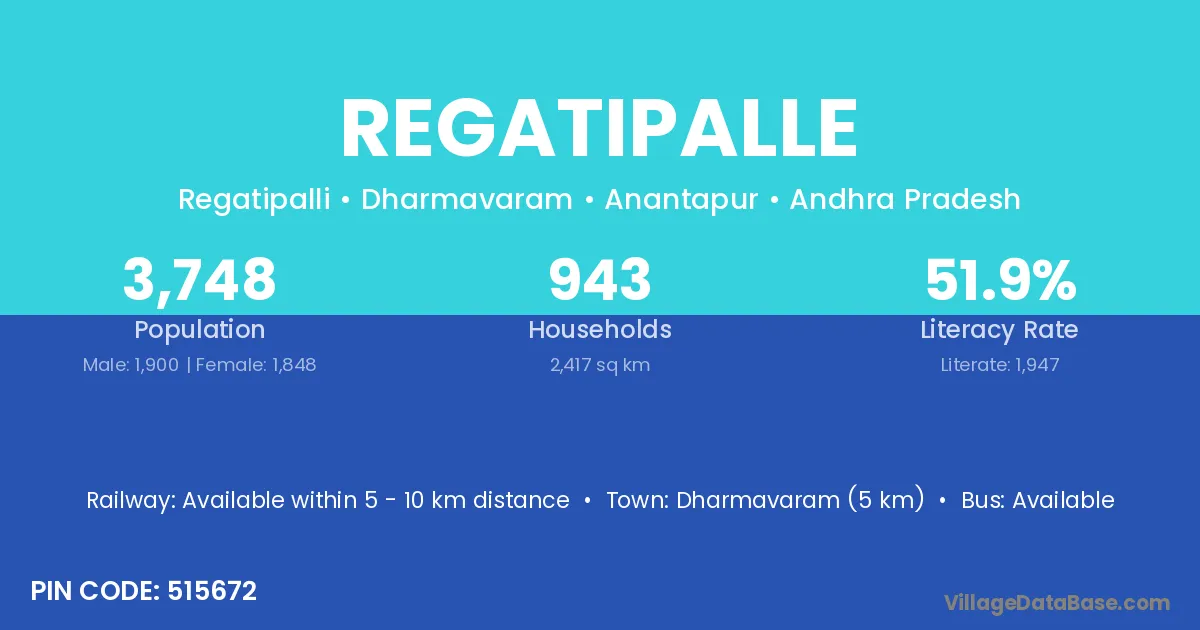 Dharmavaram (5 km) is the nearest town to Regatipalle village for major economic activities and is located approximately 5 km away.