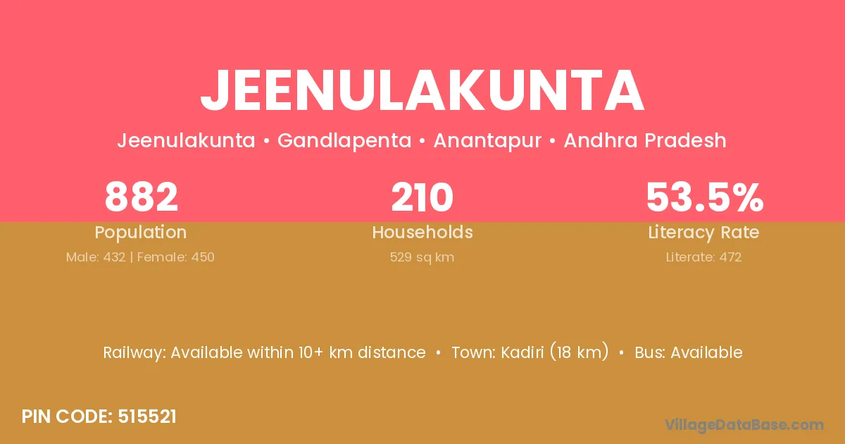 Kadiri (18 km) is the nearest town to Jeenulakunta village for major economic activities and is located approximately 18 km away.