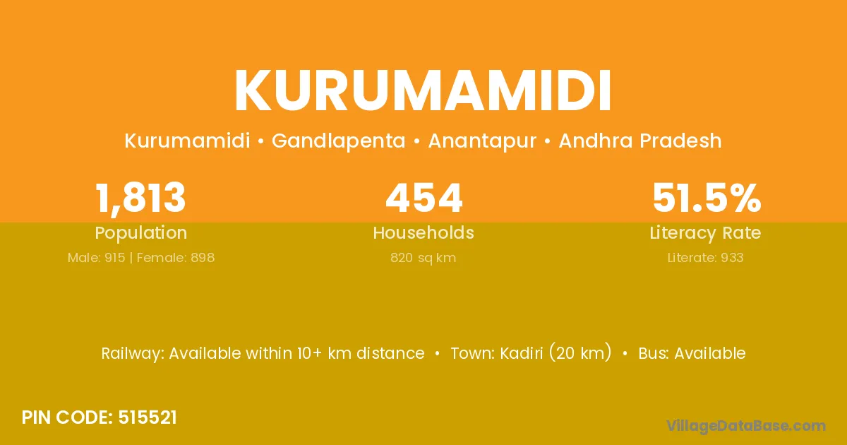 Kadiri (20 km) is the nearest town to Kurumamidi village for major economic activities and is located approximately 20 km away.
