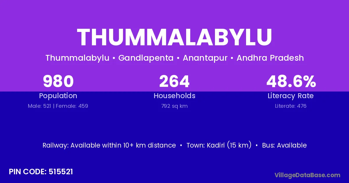 Kadiri (15 km) is the nearest town to Thummalabylu village for major economic activities and is located approximately 15 km away.