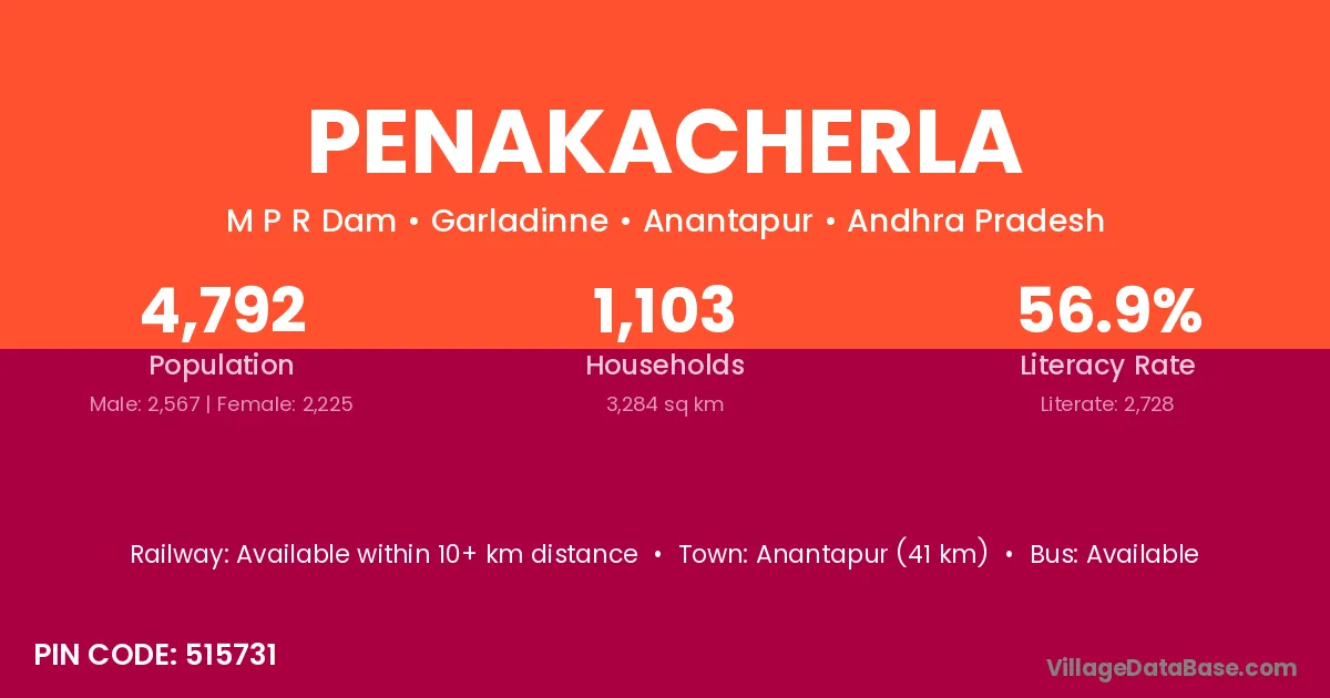 Anantapur (41 km) is the nearest town to Penakacherla village for major economic activities and is located approximately 41 km away.