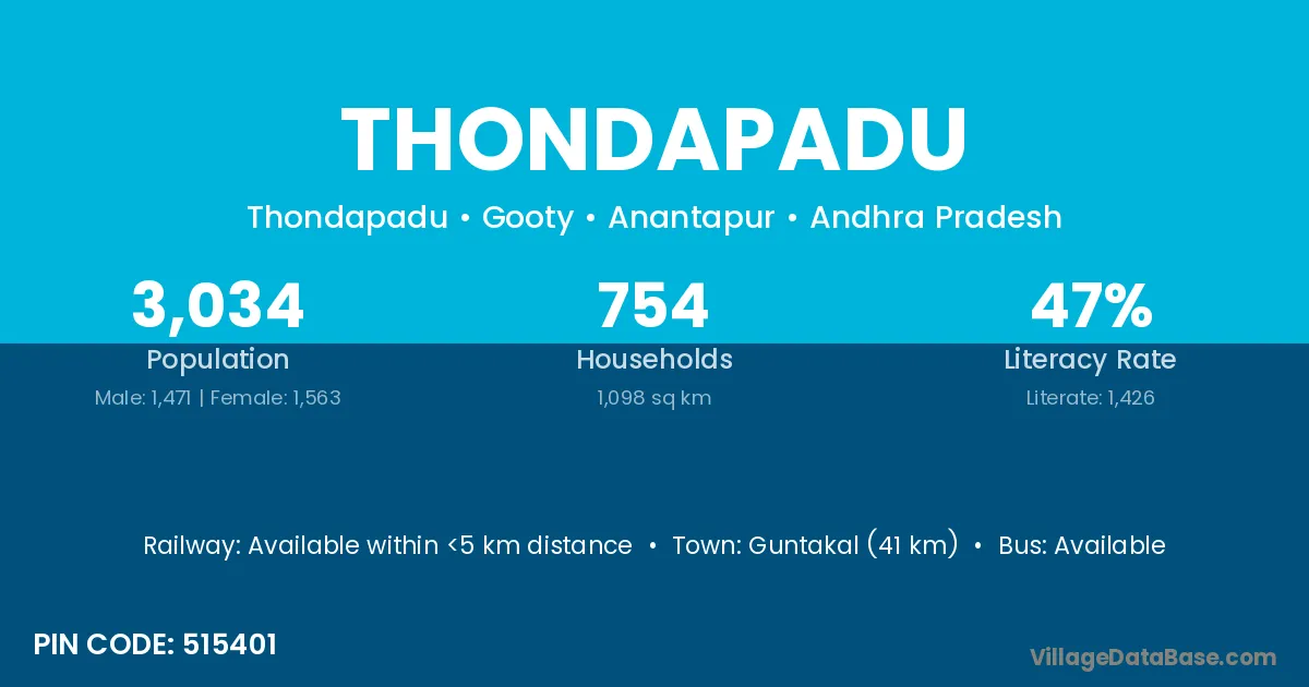 Guntakal (41 km) is the nearest town to Thondapadu village for major economic activities and is located approximately 41 km away.