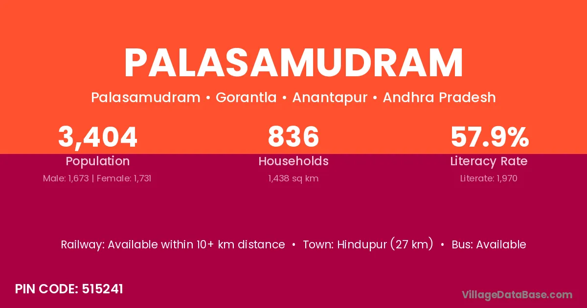 Palasamudram village has a total population of 3,404 people, of which 1,673 are males and 1,731 are females.