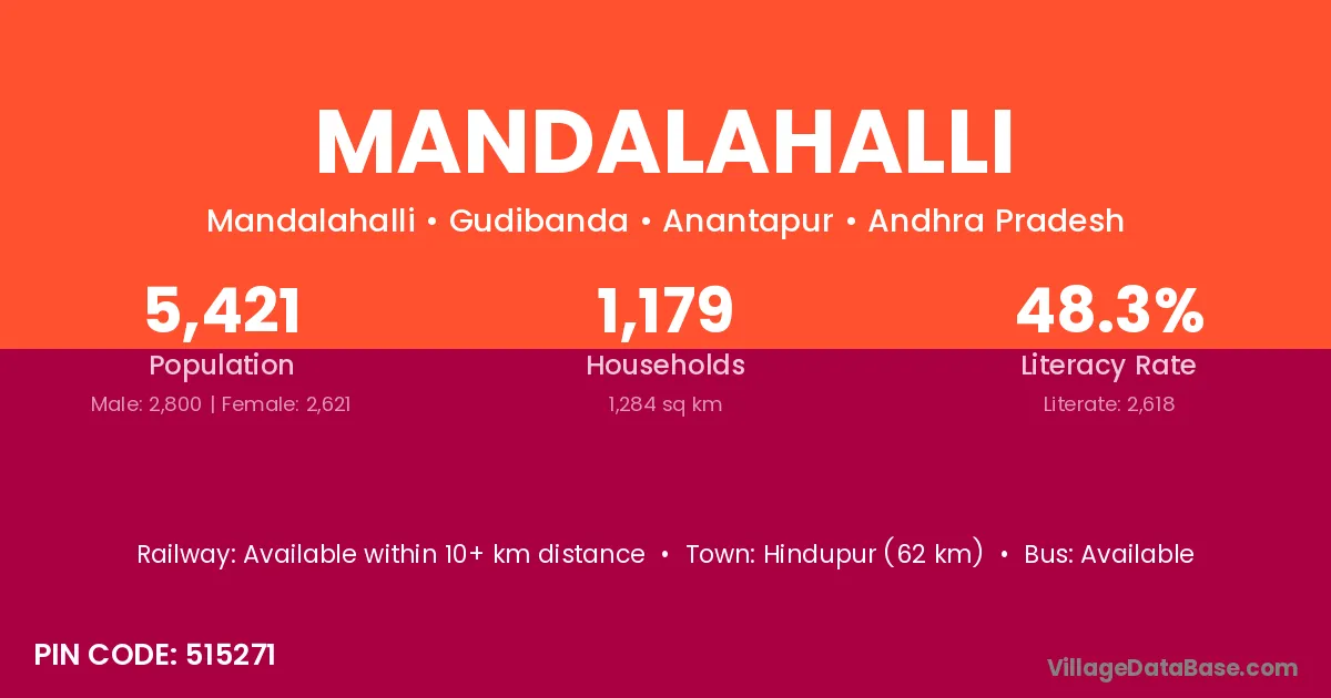 Hindupur (62 km) is the nearest town to Mandalahalli village for major economic activities and is located approximately 62 km away.