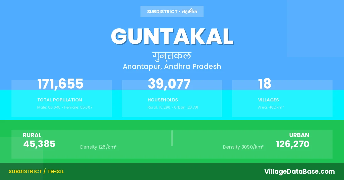 According to the 2011 census The total area of Guntakal Mandal is 402 km², with a population of 171655 people. The population density is 427 inhabitants per square kilometre, and there are approximately 39077 houses in the sub district.