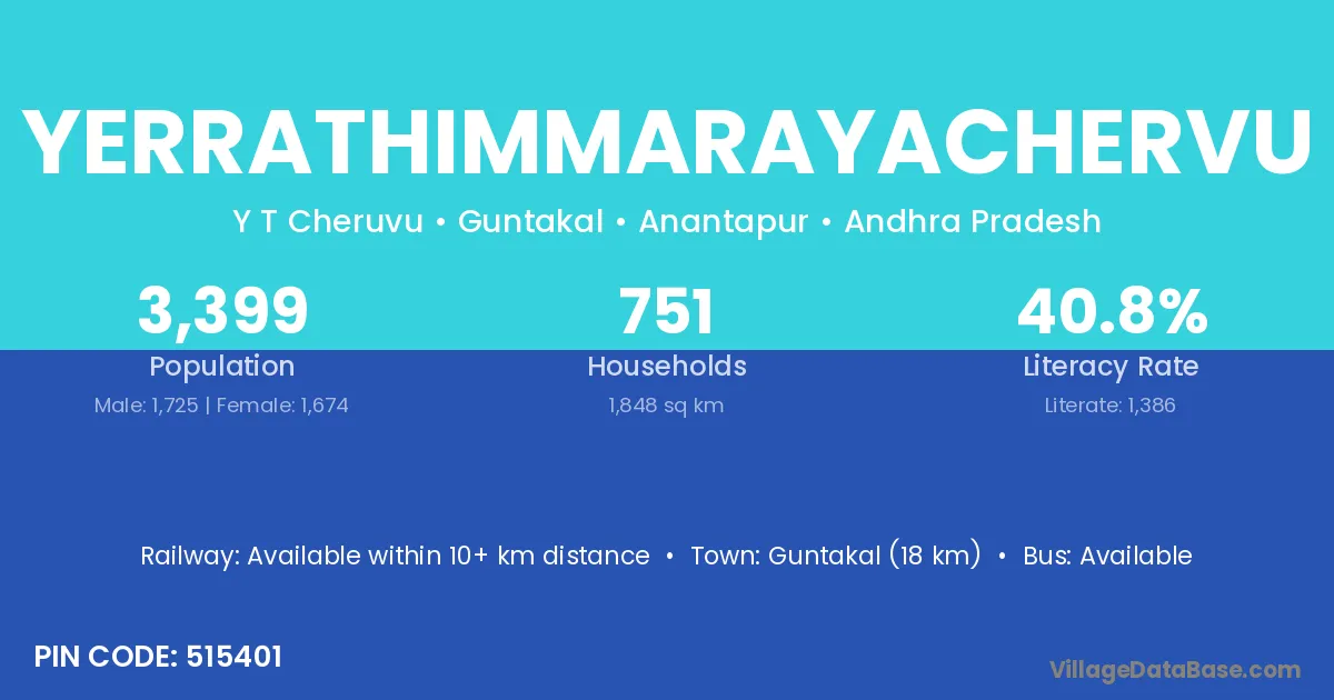 Guntakal (18 km) is the nearest town to Yerrathimmarayachervu village for major economic activities and is located approximately 18 km away.