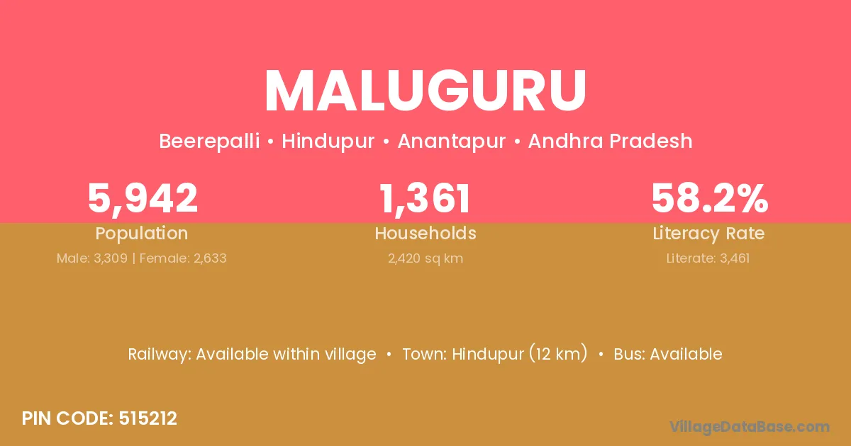 Maluguru village has a total population of 5,942 people, of which 3,309 are males and 2,633 are females.
