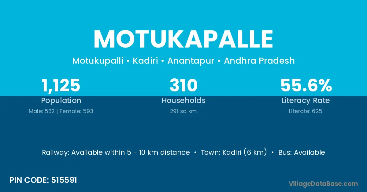 Kadiri (6 km) is the nearest town to Motukapalle village for major economic activities and is located approximately 6 km away.