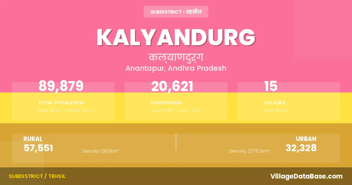 According to the 2011 census The total area of Kalyandurg Mandal is 491 km², with a population of 89879 people. The population density is 183 inhabitants per square kilometre, and there are approximately 20621 houses in the sub district.