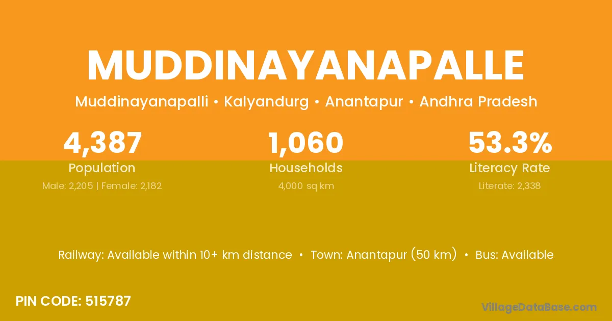 Anantapur (50 km) is the nearest town to Muddinayanapalle village for major economic activities and is located approximately 50 km away.