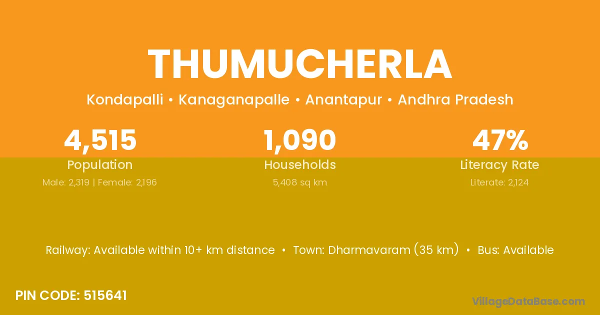 Dharmavaram (35 km) is the nearest town to Thumucherla village for major economic activities and is located approximately 35 km away.