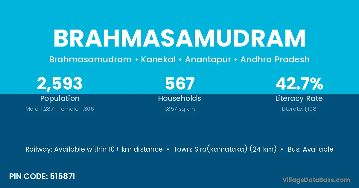 Sira(karnataka) (24 km) is the nearest town to Brahmasamudram village for major economic activities and is located approximately 24 km away.