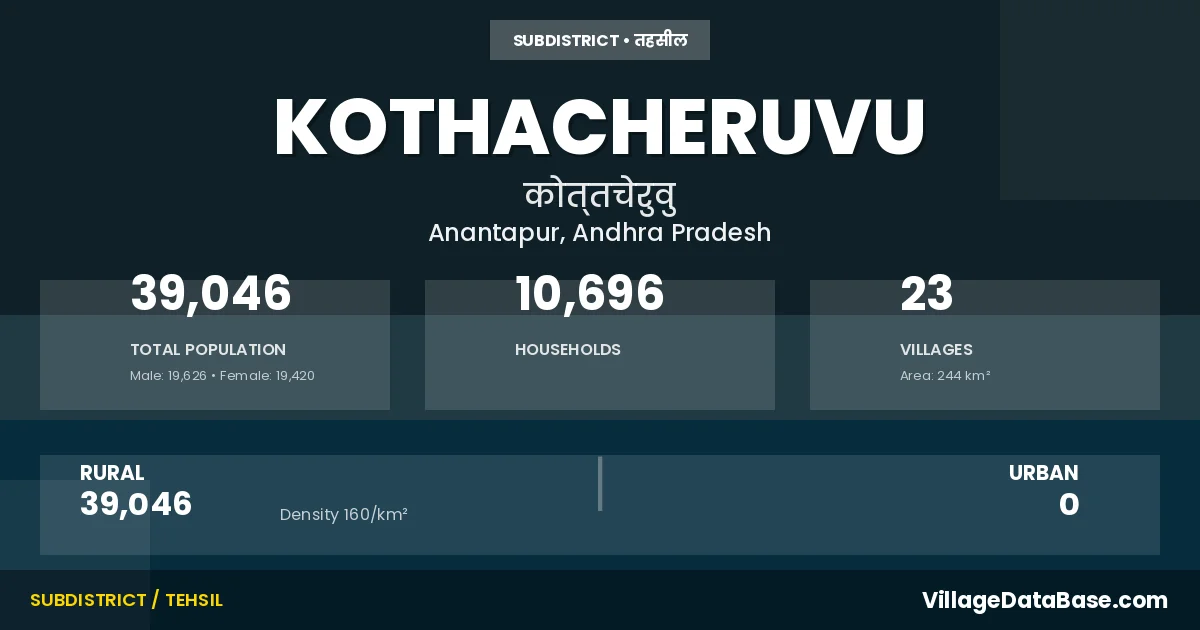According to the 2011 census The total area of Kothacheruvu Mandal is 244 km², with a population of 39046 people. The population density is 160 inhabitants per square kilometre, and there are approximately 10696 houses in the sub district.