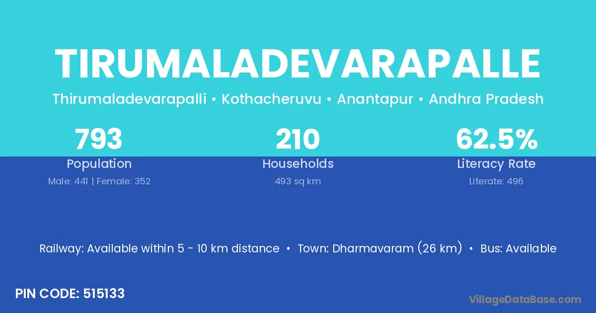 Dharmavaram (26 km) is the nearest town to Tirumaladevarapalle village for major economic activities and is located approximately 26 km away.