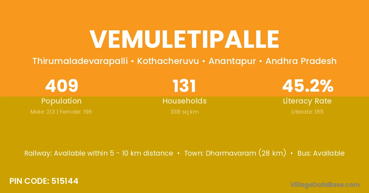 Vemuletipalle village has a total population of 409 people, of which 213 are males and 196 are females.