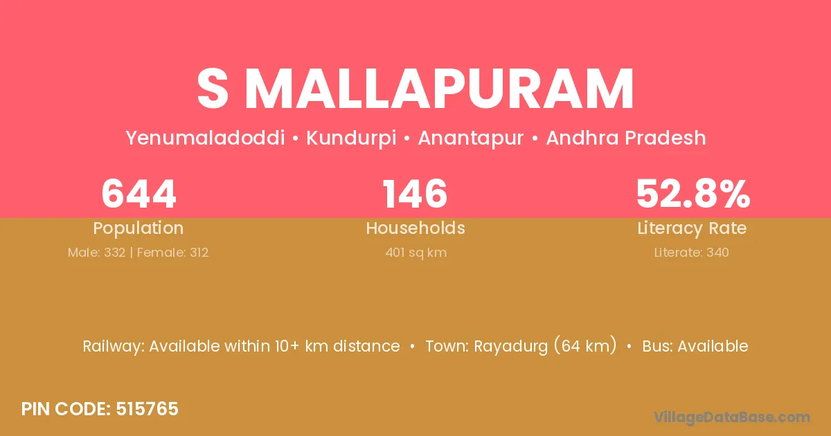 Rayadurg (64 km) is the nearest town to S Mallapuram village for major economic activities and is located approximately 64 km away.