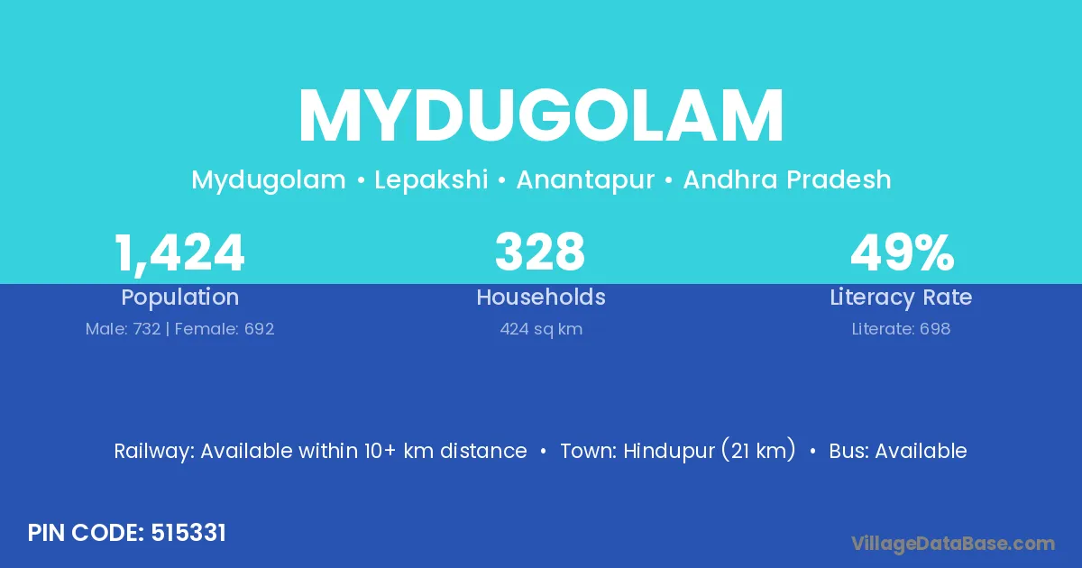Hindupur (21 km) is the nearest town to Mydugolam village for major economic activities and is located approximately 21 km away.