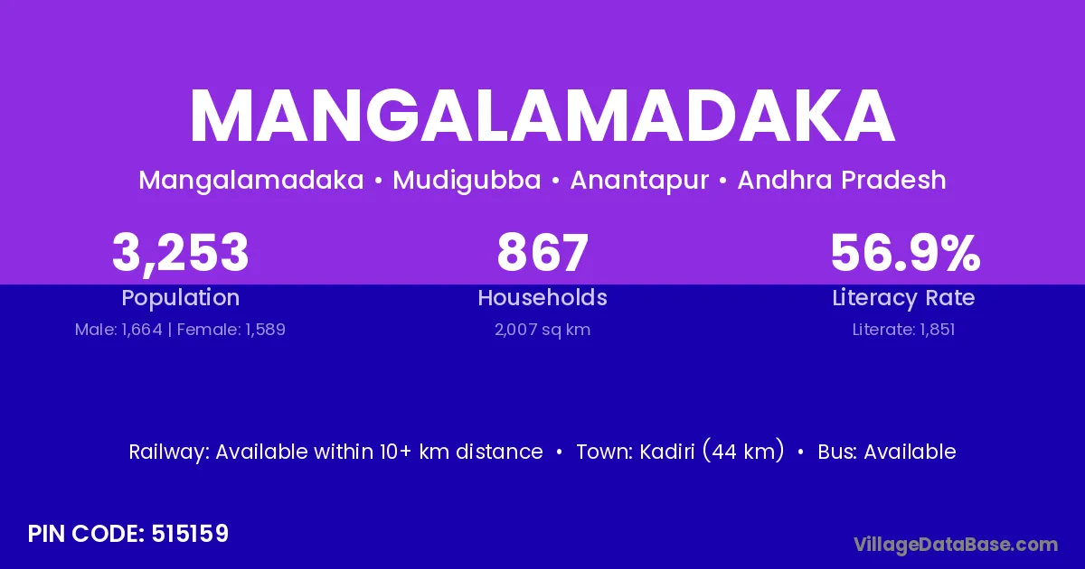 Kadiri (44 km) is the nearest town to Mangalamadaka village for major economic activities and is located approximately 44 km away.
