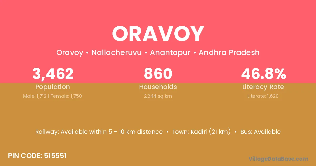 Kadiri (21 km) is the nearest town to Oravoy village for major economic activities and is located approximately 21 km away.