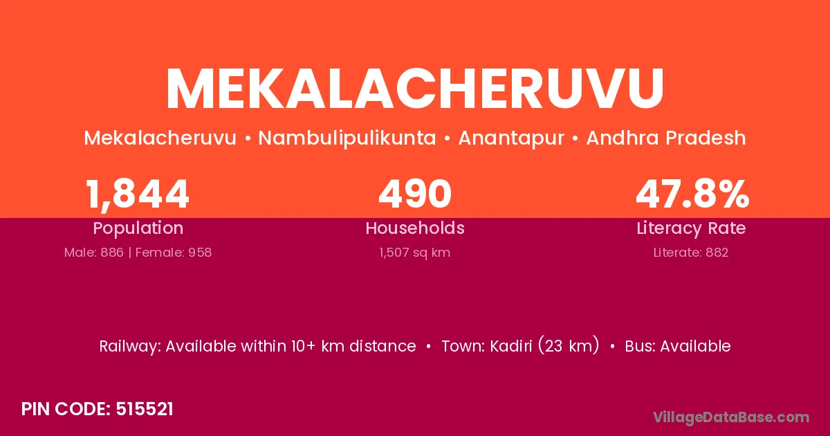 Kadiri (23 km) is the nearest town to Mekalacheruvu village for major economic activities and is located approximately 23 km away.
