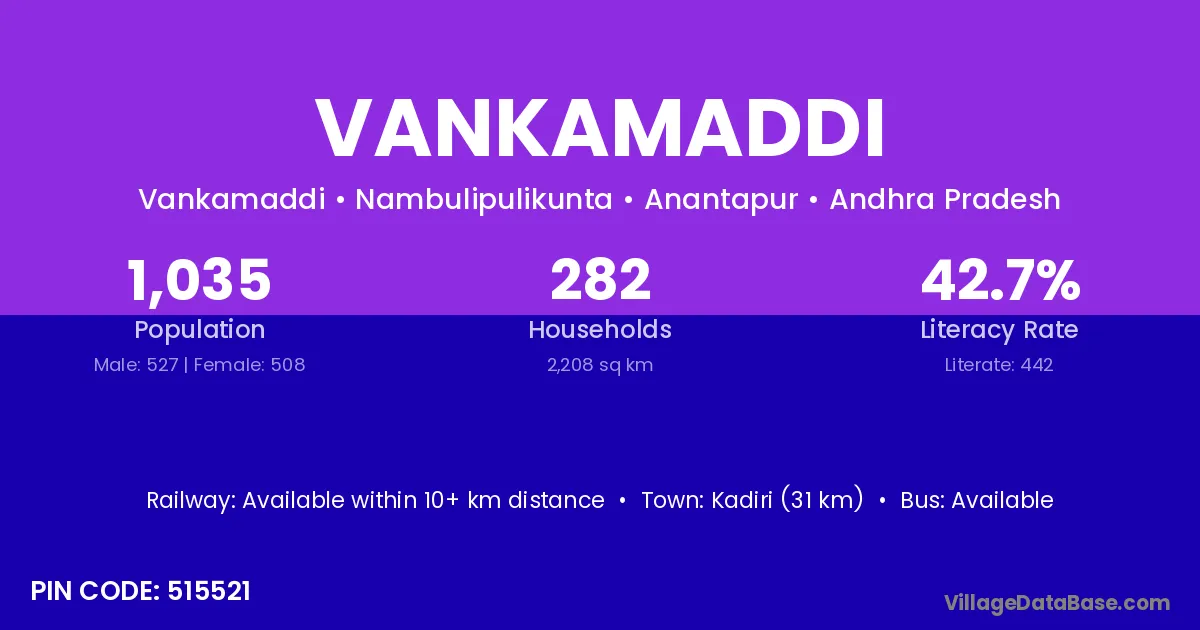 Kadiri (31 km) is the nearest town to Vankamaddi village for major economic activities and is located approximately 31 km away.