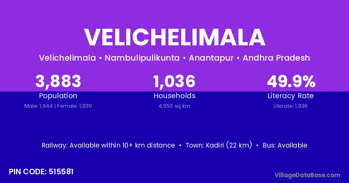 Kadiri (22 km) is the nearest town to Velichelimala village for major economic activities and is located approximately 22 km away.