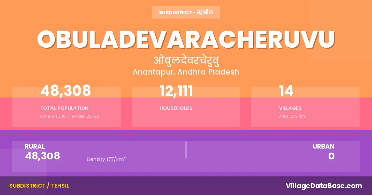 According to the 2011 census The total area of Obuladevaracheruvu Mandal is 273 km², with a population of 48308 people. The population density is 177 inhabitants per square kilometre, and there are approximately 12111 houses in the sub district.