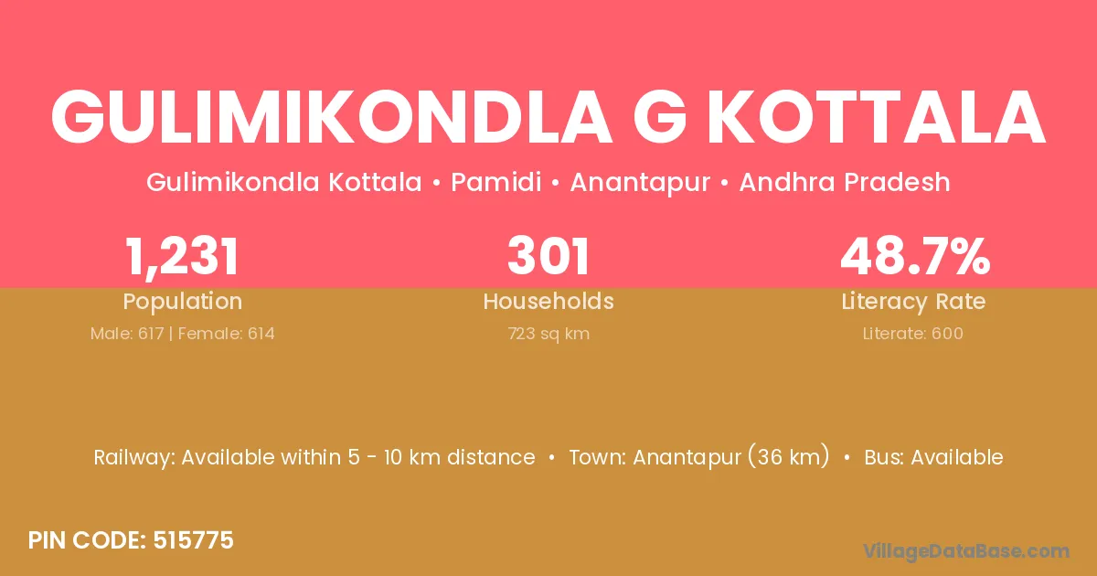 Gulimikondla G Kottala village has a total population of 1,231 people, of which 617 are males and 614 are females.