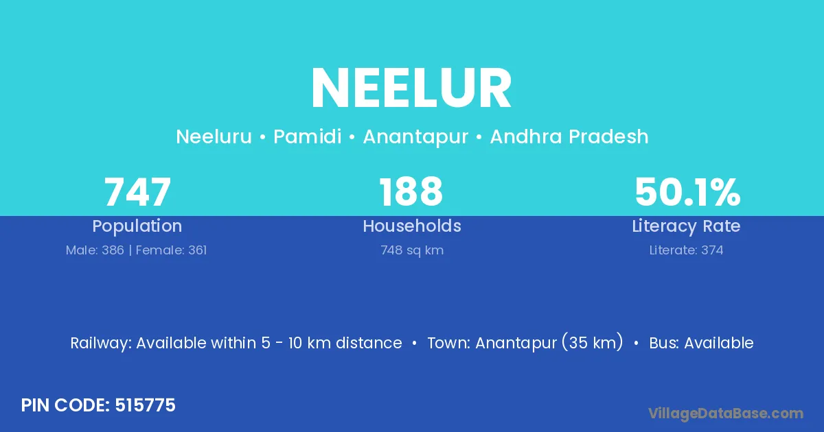 Anantapur (35 km) is the nearest town to Neelur village for major economic activities and is located approximately 35 km away.