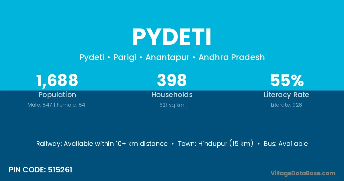 Hindupur (15 km) is the nearest town to Pydeti village for major economic activities and is located approximately 15 km away.