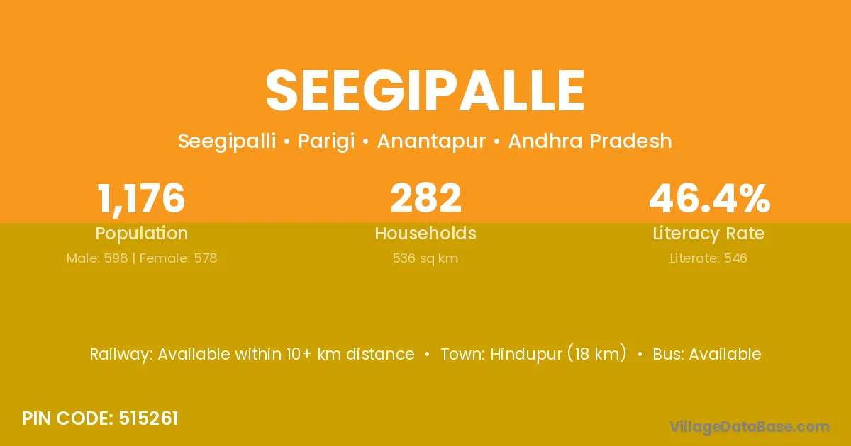 Hindupur (18 km) is the nearest town to Seegipalle village for major economic activities and is located approximately 18 km away.