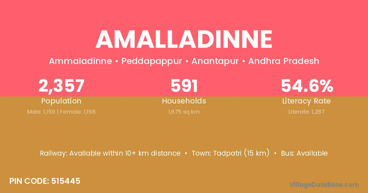 Tadpatri (15 km) is the nearest town to Amalladinne village for major economic activities and is located approximately 15 km away.