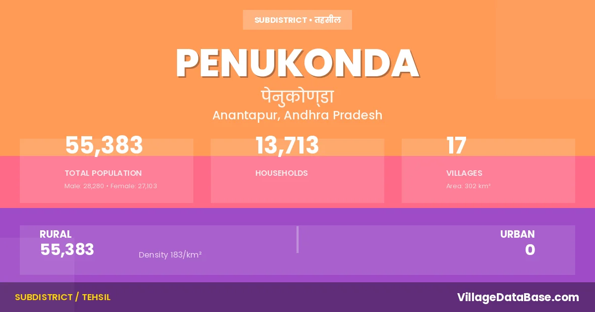 According to the 2011 census The total area of Penukonda Mandal is 302 km², with a population of 55383 people. The population density is 183 inhabitants per square kilometre, and there are approximately 13713 houses in the sub district.
