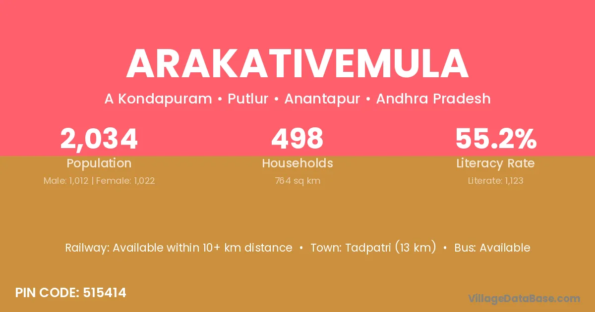 Arakativemula village has a total population of 2,034 people, of which 1,012 are males and 1,022 are females.