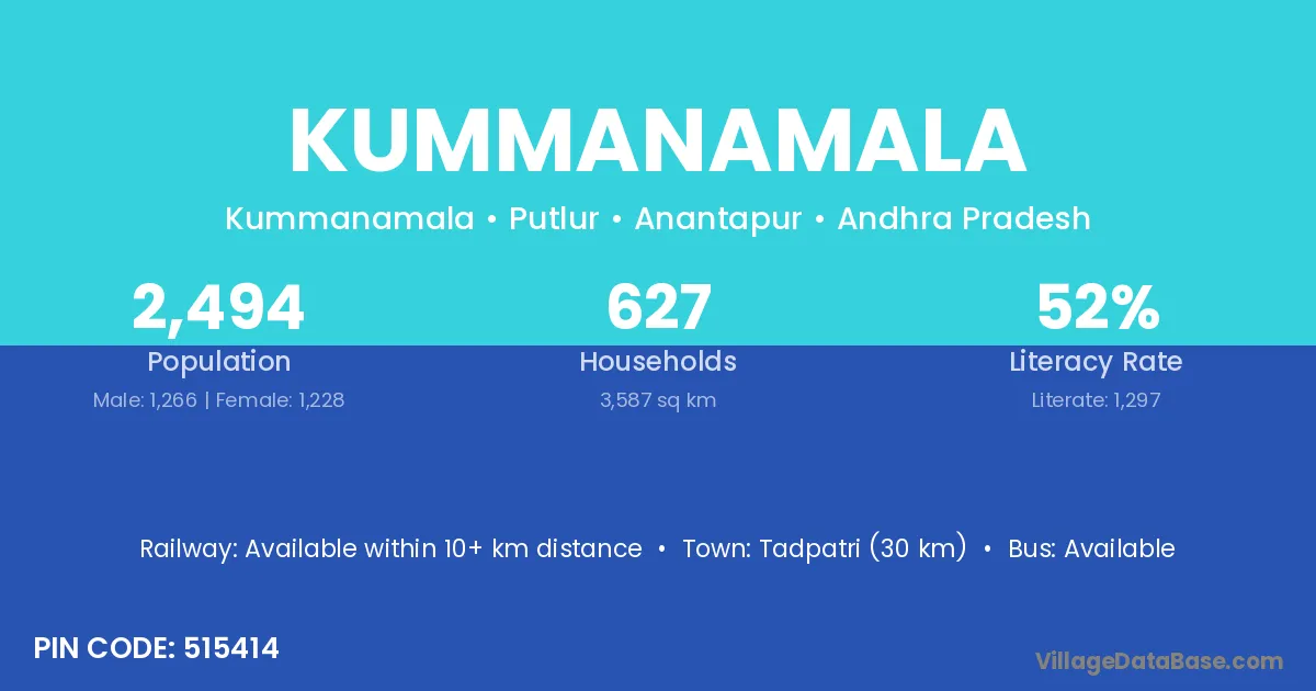 Tadpatri (30 km) is the nearest town to Kummanamala village for major economic activities and is located approximately 30 km away.