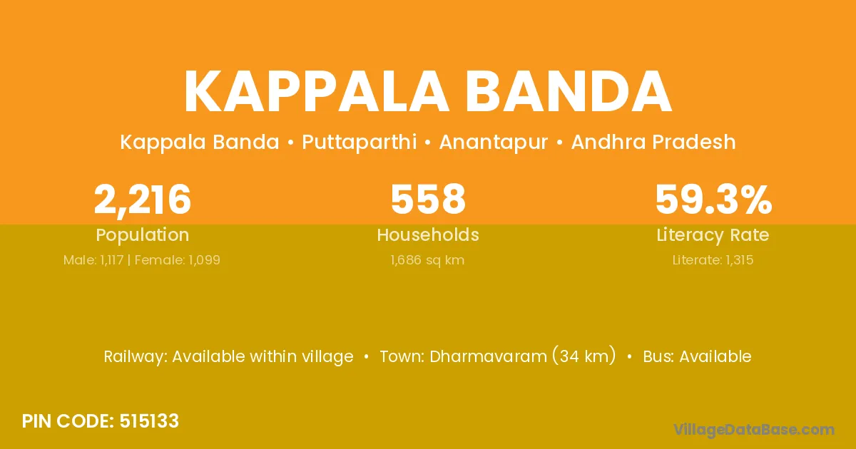 Dharmavaram (34 km) is the nearest town to Kappala Banda village for major economic activities and is located approximately 34 km away.