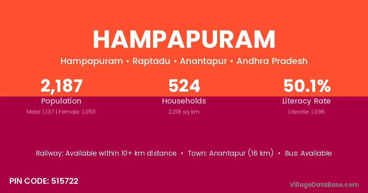 Hampapuram village has a total population of 2,187 people, of which 1,137 are males and 1,050 are females.