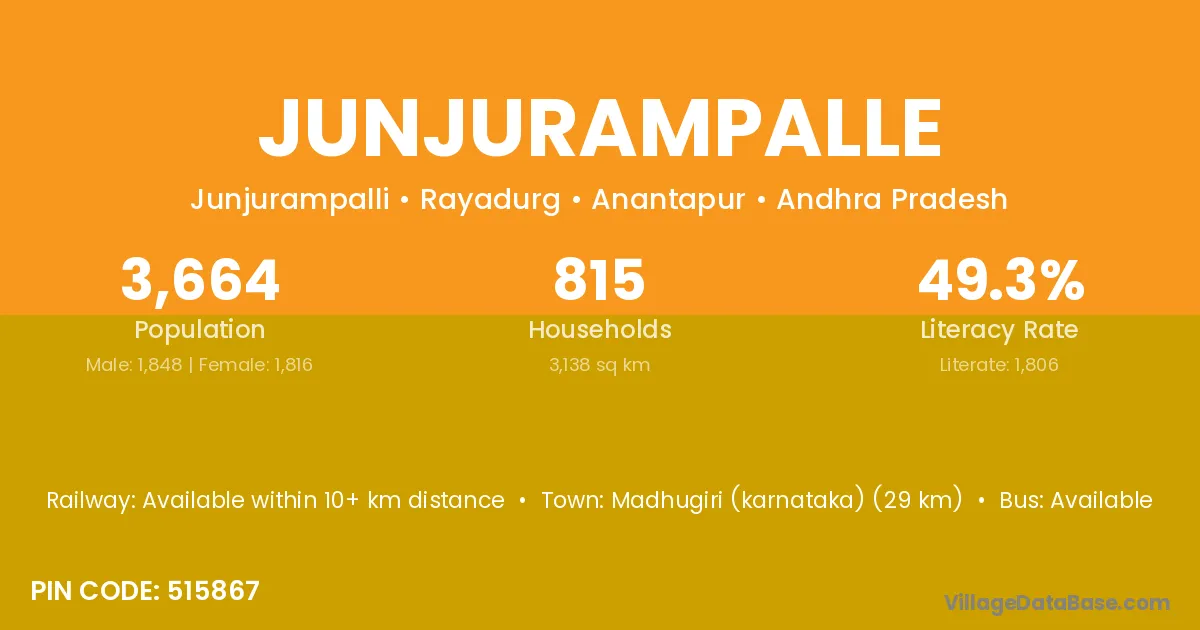 Junjurampalle village has a total population of 3,664 people, of which 1,848 are males and 1,816 are females.