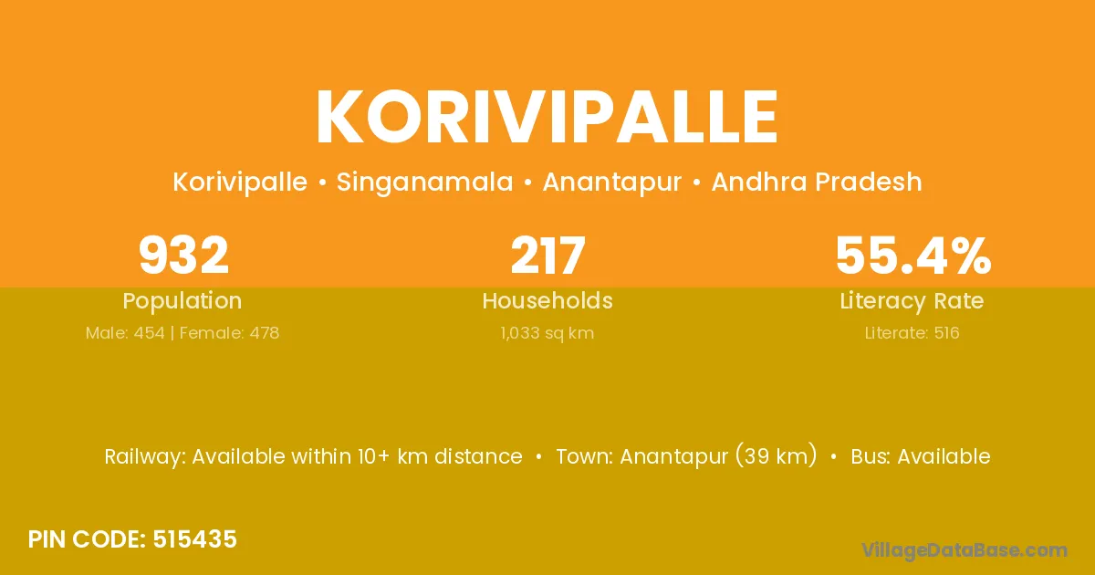Korivipalle village has a total population of 932 people, of which 454 are males and 478 are females.