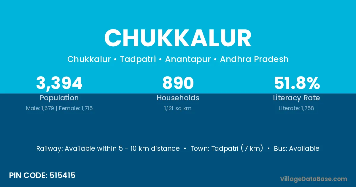 Tadpatri (7 km) is the nearest town to Chukkalur village for major economic activities and is located approximately 7 km away.