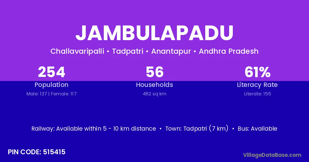 Tadpatri (7 km) is the nearest town to Jambulapadu village for major economic activities and is located approximately 7 km away.