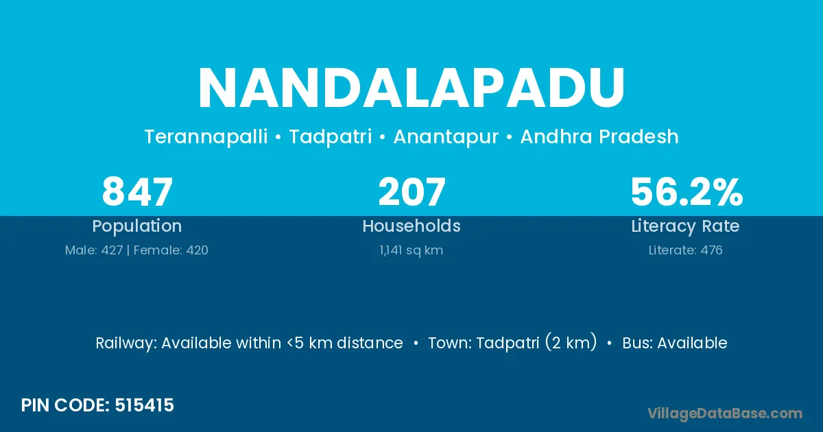 Tadpatri (2 km) is the nearest town to Nandalapadu village for major economic activities and is located approximately 2 km away.