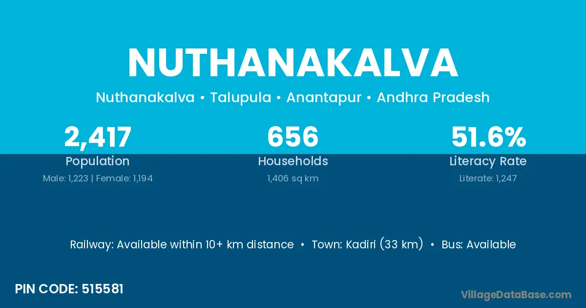 Kadiri (33 km) is the nearest town to Nuthanakalva village for major economic activities and is located approximately 33 km away.