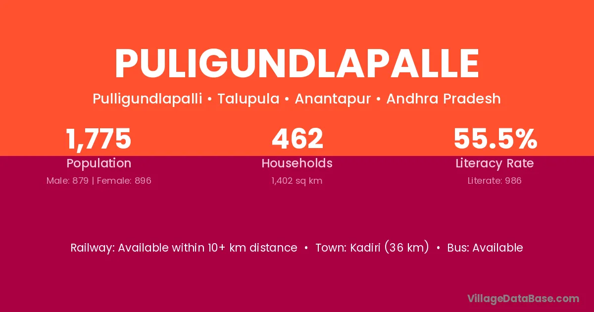Kadiri (36 km) is the nearest town to Puligundlapalle village for major economic activities and is located approximately 36 km away.