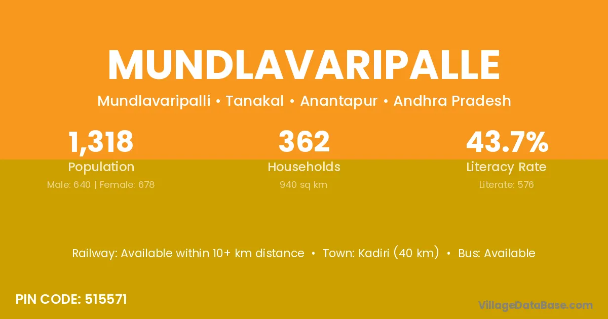 Kadiri (40 km) is the nearest town to Mundlavaripalle village for major economic activities and is located approximately 40 km away.