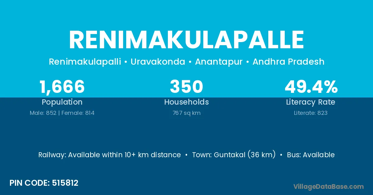 Guntakal (36 km) is the nearest town to Renimakulapalle village for major economic activities and is located approximately 36 km away.