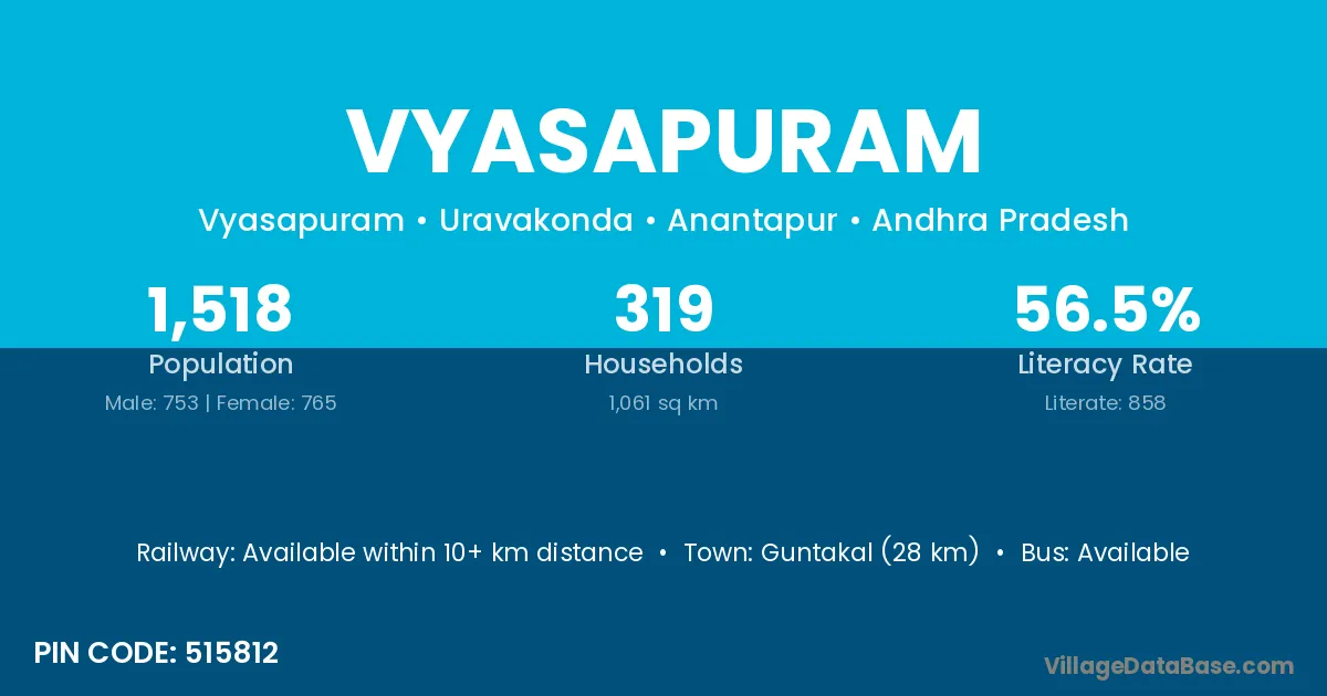 Guntakal (28 km) is the nearest town to Vyasapuram village for major economic activities and is located approximately 28 km away.