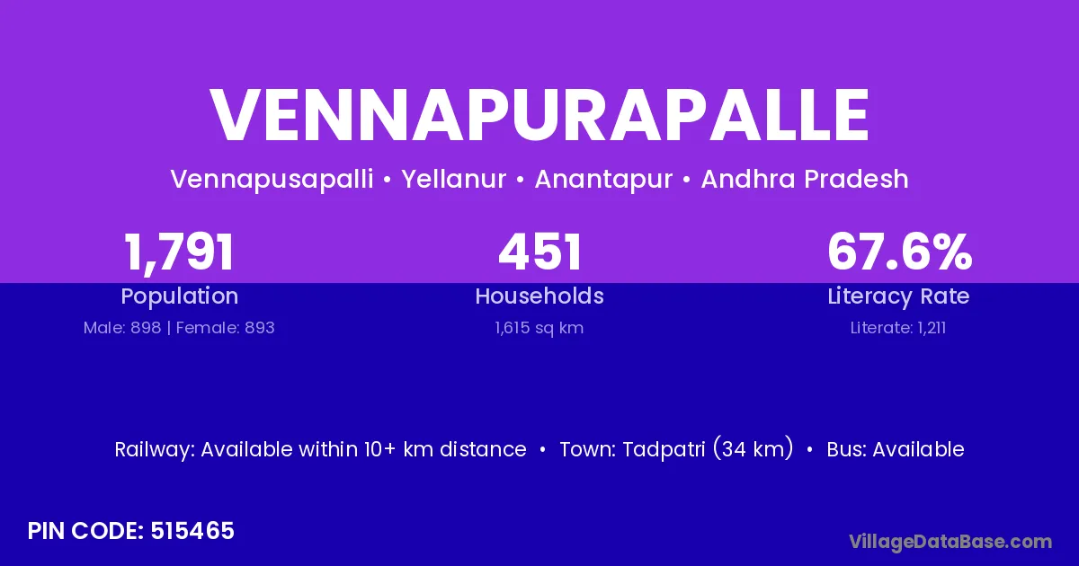 Tadpatri (34 km) is the nearest town to Vennapurapalle village for major economic activities and is located approximately 34 km away.