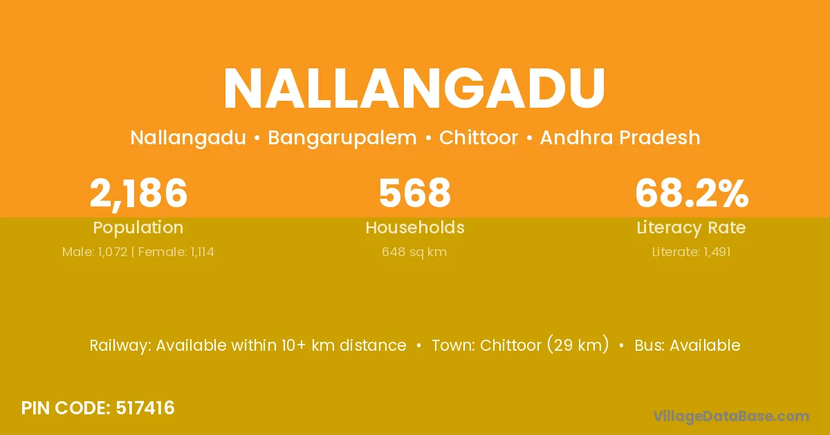 Chittoor (29 km) is the nearest town to Nallangadu village for major economic activities and is located approximately 29 km away.