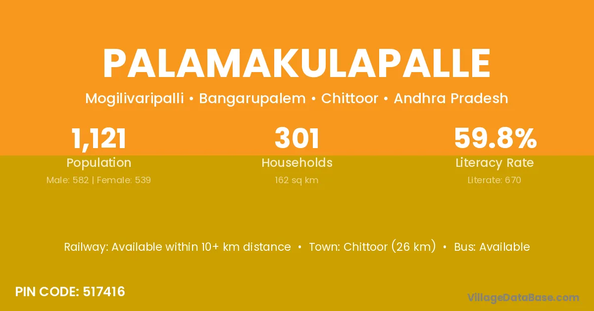Palamakulapalle village has a total population of 1,121 people, of which 582 are males and 539 are females.